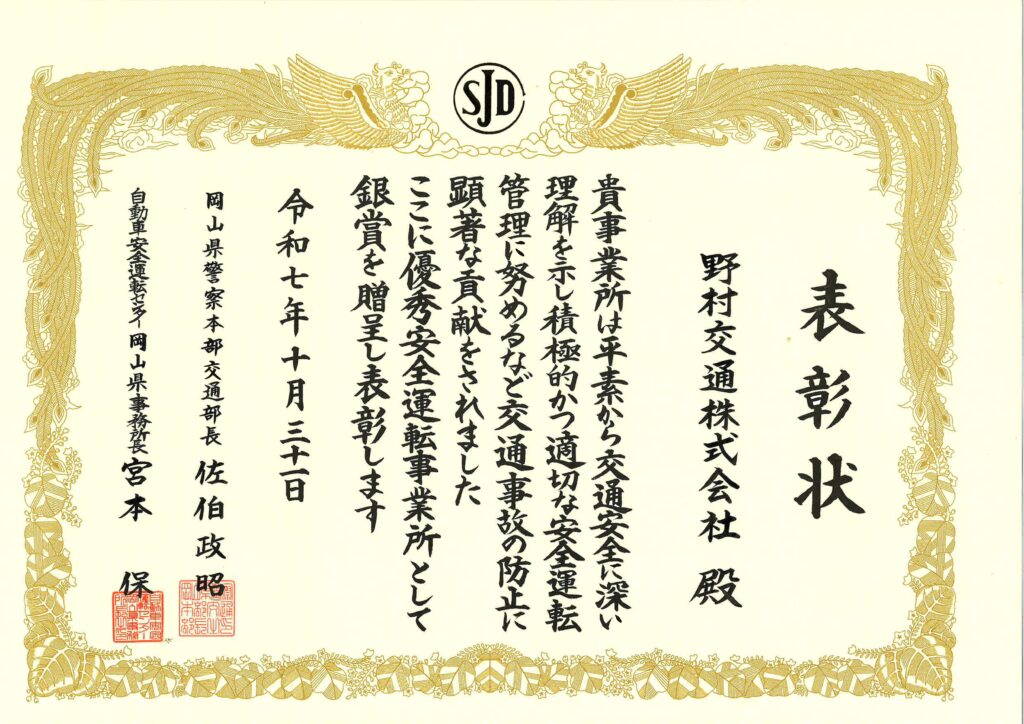 この度、野村交通株式会社は、自動車安全運転センターおよび岡山県警察本部より「優秀安全運転事業所(銀賞)」として表彰を受けました。